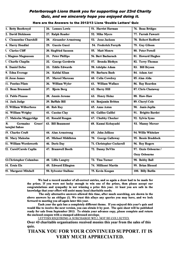 As always, a huge thanks is owed to everyone who helped sell our quiz, whether directly for Peterborough Lions Club or for the many other charities and community groups who benefited on a 50:50 basis.